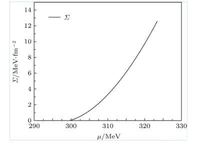 利用薄壁近似,圖2給出了當T=Tc時,夸克強子一級相變的表面張力隨夸克化學勢的變化??芍谝患壪嘧儏^域,當化學勢增大時,強子相的表面張力也隨著化學勢增大。當溫度接近零時,強子夸克相變的表面張力約為12.6 MeV/fm2.在T→0的情況,本文理論預言與文獻一致,但該文獻只是考慮T=0的冷夸克物質的夸克強子一級相變。