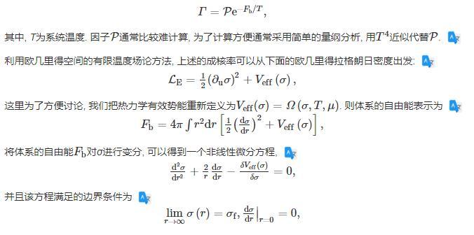 為偽真空下的σ場的真空期望值。也就是說,遠離真真空泡泡的中心,體系處于亞穩態,相當于真真空的泡泡在偽真空中產生并膨脹。