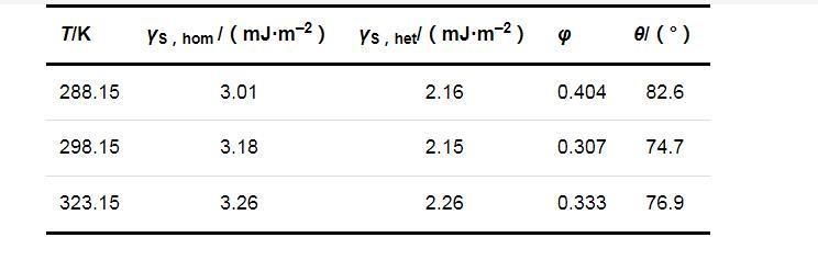 由圖6可以看出,兩種成核機(jī)制的分界點大約在S=12.13處,過飽和度小于此數(shù)值時成核以非均相成核為主,大于此數(shù)值后成核以均相成核為主.添加NaCl后,兩種成核機(jī)制的固-液界面張力(γS,hom和γS,het)、形狀因子(φ)和接觸角(θ)的計算結(jié)果列于表4.可以看出,在同一溫度下,均相成核時的固-液界面張力大于非均相成核時的固-液界面張力;溫度的改變對固-液界面張力的影響仍不明顯.通過對比表2與表4的數(shù)據(jù)可知,添加NaCl后Li2CO3晶核與周圍溶液的固-液界面張力與未添加NaCl時的數(shù)值相比略有減小,所以在Li2CO3成核過程中,NaCl的添加對晶核與周圍溶液的固-液界面張力的影響可以忽略.