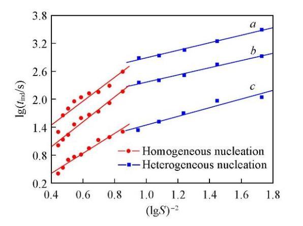 誘導(dǎo)期與初始過飽和度之間存在著很強(qiáng)的依賴關(guān)系.當(dāng)初始過飽和度足夠高時,成核可認(rèn)為是均相的;當(dāng)初始過飽和度足夠低時,成核則以非均相為主[37].在恒定溫度下,由晶體成核過程中的lgtind對(lgS)?2作圖可得兩條斜率不同的直線,分別對應(yīng)著兩種不同的成核機(jī)制,即初級均相成核和初級非均相成核[37].由不同溫度時Li2CO3的lgtind對(lgS)?2作圖,結(jié)果如圖3所示.可知,成核機(jī)制的變化引起了直線斜率的改變,均相成核對應(yīng)的直線斜率明顯大于非均相成核時的直線斜率(Bhom>Bhet).在較低的過飽和度時,成核以非均相成核為主;而過飽和度增大到12.13以后,成核則以均相成核為主.