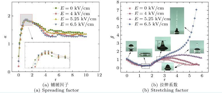 為了更詳細地研究垂直電場對液滴鋪展的影響,根據實驗獲得的連續照片分別測量了液滴演變過程中動態鋪展直徑L。圖3(a)描述了無電場和三種不同模式下液滴的鋪展因子α隨無量綱時間τ的變化。液滴撞擊后在短時間內擴散并且幾乎同時達到最大鋪展狀態,隨后液滴開始回縮,對應的鋪展因子趨勢下降,最后進入液滴振蕩階段,由于液滴和表面的釘住作用,鋪展因子逐漸趨于穩定。從圖3(a)可以看出,不同場強下的液滴在τ=1.19時達到最大鋪展,并且最大鋪展因子隨著電場強度的增加而小幅度增大,這是因為分布在液滴表面上的同類自由電荷之間的庫侖斥力會引入與表面張力相反方向的靜電力,額外的靜電力會減弱液體表面張力,進一步增強液滴的擴散。無電場與場強最大的液滴的最大鋪展因子相差小于2%,說明在液滴鋪展階段,電場力不是主導影響因素,這與前人的研究結果保持基本一致。
