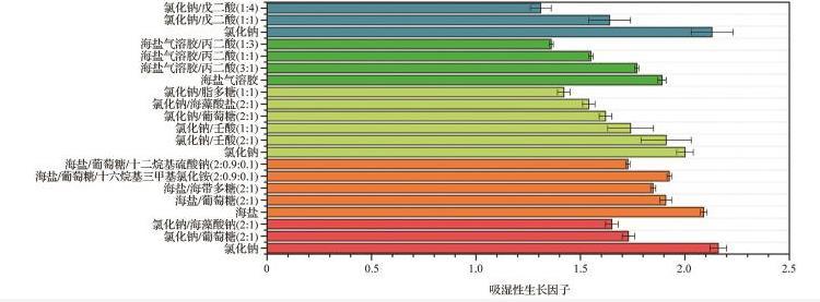 在實(shí)驗(yàn)室中通過吸濕串聯(lián)差分電遷移率分析儀測量給定RH下的粒徑與干粒徑的比值,以通過吸濕性生長因子來量化吸濕性。最近許多研究關(guān)注到表面活性物質(zhì)對顆粒吸濕性的影響。圖4總結(jié)了當(dāng)前一些研究中量化的表面活性物質(zhì)對SSA模擬物吸濕性的影響。
