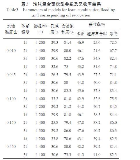 隨著水油黏度比的增大,3種泡沫復(fù)合體系采收率增幅的差異逐漸減小,水油黏度比界限為0.150:①當(dāng)水油黏度比小于該界限,分別為0.010,0.045和0.100時(shí),1#超低界面張力泡沫復(fù)合體系驅(qū)油采收率增幅分別為25.6%,31.6%和37.8%;2#乳化泡沫復(fù)合體系驅(qū)油采收率增幅分別為21.6%,27.2%和32.6%,較1#采收率增幅低,1#超低界面張力泡沫復(fù)合體系驅(qū)油效果強(qiáng)于2#乳化泡沫復(fù)合體系,后者不能替代前者;3#雙效泡沫復(fù)合體系驅(qū)油采收率增幅分別為34.8%,40.0%和40.7%,較1#高9.2%,8.4%,2.9%;可見,在超低界面張力基礎(chǔ)上增強(qiáng)體系乳化性能,能夠明顯改善驅(qū)油效果。