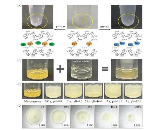 所制備的水/水微囊具有良好的生物相容性、尺寸均一性及較高的包裹率和裝載率,是各種活性物質的理想載體,并且能夠對pH變化做出響應,實現可控釋放。如圖5(A)所示,水/水微囊的殼層是由二價鈣離子交聯的海藻酸鈉水凝膠組成,在酸性環境下具有良好的穩定性,但在堿性環境下海藻酸鈉水凝膠與二價鈣離子的結合能力變弱,交聯網絡被破壞,從而釋放內核活性物質。如果在溶液中加入檸檬酸鈉,二價鈣離子更傾向于與檸檬酸根結合,從而破壞交聯網絡,也可以溶解水/水微囊。如圖5(C)所示,水/水微囊的溶解速率隨pH的增大而提高。當水/水微囊的囊壁被溶解后,內核物質逐漸被釋放出來,展現出良好的pH響應性和可控釋放。