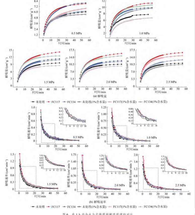 由圖6a可知,隨著甲烷吸附平衡壓力的增加,3種處理方式的含水煤樣解吸量均逐漸增加,且增加量均呈現逐漸減小趨勢。經過氣潤濕反轉劑FC117和FC134處理后的含水煤樣解吸量始終大于未處理的煤樣,與干燥煤樣解吸量的規律基本一致。同時,在3種不同處理方式條件下,干燥煤樣的解吸量均大于含水條件下的解吸量,其結果表明在含水煤樣解吸過程中存在一定程度的水鎖效應。