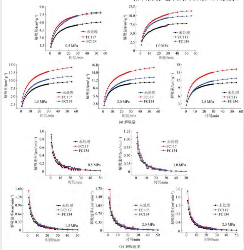 為了得到氣潤濕反轉劑處理前后含水(1%含水率)煤樣的解吸規律,依次對不同吸附平衡壓力條件下的煤樣進行解吸試驗,通過對比干燥與含水煤樣的解吸量和解吸速率,進而定量分析氣潤濕反轉劑消除水鎖效應,如圖6所示。