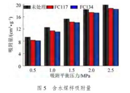 由圖5可知,隨著甲烷吸附平衡壓力的增加,氣潤濕反轉劑處理前后煤樣的吸附量均逐漸增加,且增加量均呈現逐漸減小趨勢。經過氣潤濕反轉劑FC117和FC134處理后的煤樣吸附量始終小于未處理的煤樣,其變化規律與干燥煤樣的吸附量一致。其中,含水煤樣的吸附量略小于干燥煤樣的吸附量,其主要原因是在含水率為1%的煤樣中,少量的水滯留在煤體內部。一方面,由于水的體積侵占了原本甲烷分子存在的空間;另一方面,由于煤樣自身的親水性,水在煤體表面的吸附能力強于甲烷氣體,使得部分吸附狀態的甲烷分子被置換和驅替。因此,含水煤樣的甲烷吸附量略小于干燥煤樣的吸附量。