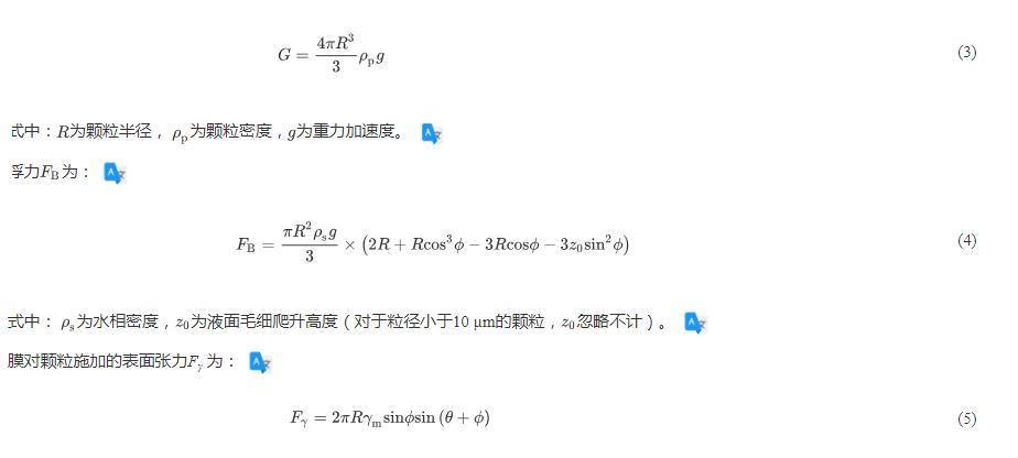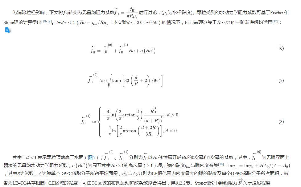 顆粒的水動力學阻力系數取決于顆粒在水相中的浸沒程度(圖5,以顆粒暴露在空氣中的高度d表示)。顆粒的平衡位置取決于重力、浮力及膜施加的表面張力。重力G為: