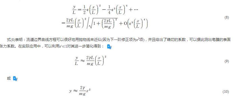 Sane等推導(dǎo)了表面張力系數(shù)與尼龍繩曲線方程的關(guān)系,但并未獲得曲線方程的精確解,而是采用高階多項式對實測曲線進行擬合,發(fā)現(xiàn)選取二階多項式可以得到較好的結(jié)果,從而也獲得了式(10),并通過擬合系數(shù)得到了表面張力系數(shù)。本文的嚴格推導(dǎo)說明:流道邊界曲線是拋物線加上高兩階小量的修正。圖(2)也證明了這一推導(dǎo)結(jié)論的正確性。