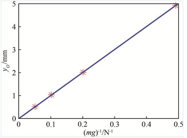 圖3給出了在同一皂液流量Q=35 mL/min下測得的流道中點O的位移隨砝碼質(zhì)量的變化以及根據(jù)式(11)擬合的直線。所有數(shù)據(jù)點都很好地落在過原點的擬合直線上,進一步驗證了本文推導(dǎo)的正確性。根據(jù)直線斜率測得的表面張力系數(shù)γ=27.1 mN/m,與前述拋物線擬合法得到的結(jié)果相近。