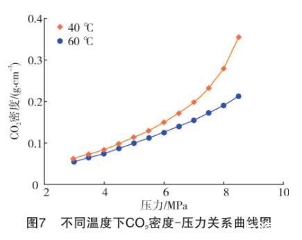 一方面,高溫可以對液體分子之間的相互作用力產(chǎn)生削弱作用,加劇分子間的不規(guī)則運動。此時,CO2氣體分子更容易與液相發(fā)生混溶,而定量表現(xiàn)出來的就是界面張力的降低。另一方面,根據(jù)混合烷烴和CO2的密度和二者的密度差數(shù)據(jù),繪制出不同溫度下CO2氣體密度和氣液密度差隨壓力升高的變化曲線,如圖7~圖9所示。從密度差-壓力曲線(見圖9)來看,隨著溫度升高,在可比較的實驗壓力范圍內(nèi),中低壓(3~6 MPa)下不同溫度的氣液密度差非常接近,可以忽略不計。但高于6 MPa后,高溫下氣液密度差逐漸加大。較高的密度差導致了氣液難以形成混相,同一壓力下界面張力更大。