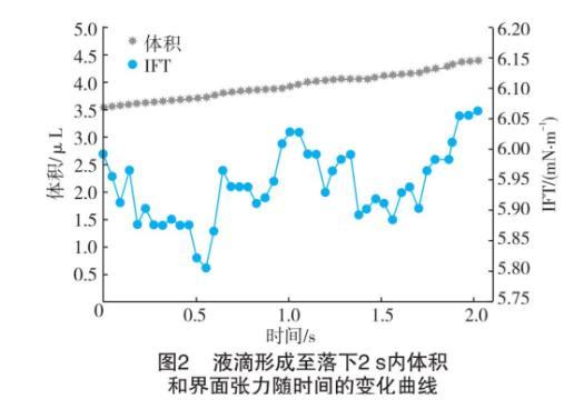 圖2為40℃、6.5 MPa時,液滴形成至落下的2 s內(nèi)液滴體積和測得的界面張力隨時間的變化。由圖2可看出,在落下過程中體積逐漸變大,界面張力誤差在0.3 mN/m之內(nèi),雖然浮動不是很大,但任取一點不能較好地體現(xiàn)整體。因此,選擇在懸滴完全形成開始計算,到完全落下以幀為間隔,因為液滴完全形成時可以較清晰地得到液滴的最大曲率半徑,批量計算這段時間內(nèi)的界面張力值,最后得到其平均值。為避免液滴的隨機性,在每種環(huán)境下選取3個連續(xù)滴落的液滴的平均界面張力值作為最終結果。減少了實驗的偶然性,使得到的結果更加可信。