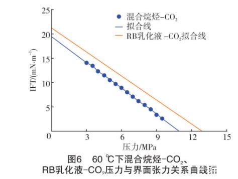 假設RB乳化液-原油不考慮斜率變化部分,始終以低壓階段(小于6 MPa)的斜率表示界面張力的變化。將表中同一溫度下不同系統(tǒng)的關系式展現(xiàn)在曲線圖上(見圖5和圖6)。從圖5和圖6可知,不論在哪個溫度下,混合烷烴和RB乳化液的壓力-界面張力曲線都接近平行,即兩種油的界面張力隨著壓力的升高幾乎以同樣的速度降低。計算得知,40℃和60℃下實驗混合烷烴和RB原油的壓力-界面張力關系式中的斜率誤差為6.0%和8.6%。縱觀兩種油的組成發(fā)現(xiàn),本實驗所使用的混合烷烴中正十二烷的摩爾分數(shù)達71.07%,而RB原油中的C12+的摩爾分數(shù)達到57.66%。也就是說,混合烷烴和原油的組分中占主導作用的是高碳數(shù)的正構烷烴。據(jù)姬澤敏等的大量實驗研究,界面張力在不同的正構烷烴-CO2體系中具有極好的規(guī)律性,在相同的溫度壓力條件下,正構烷烴的碳數(shù)和界面張力成正比關系。從文獻中RB原油組成分析得知,C12+的分子量高達366 g/mol,而本實驗中的混合烷烴的分子量僅為156.74 g/mol。由此得知,實驗誤差的主要來源是高碳正構烷烴的組成不同。