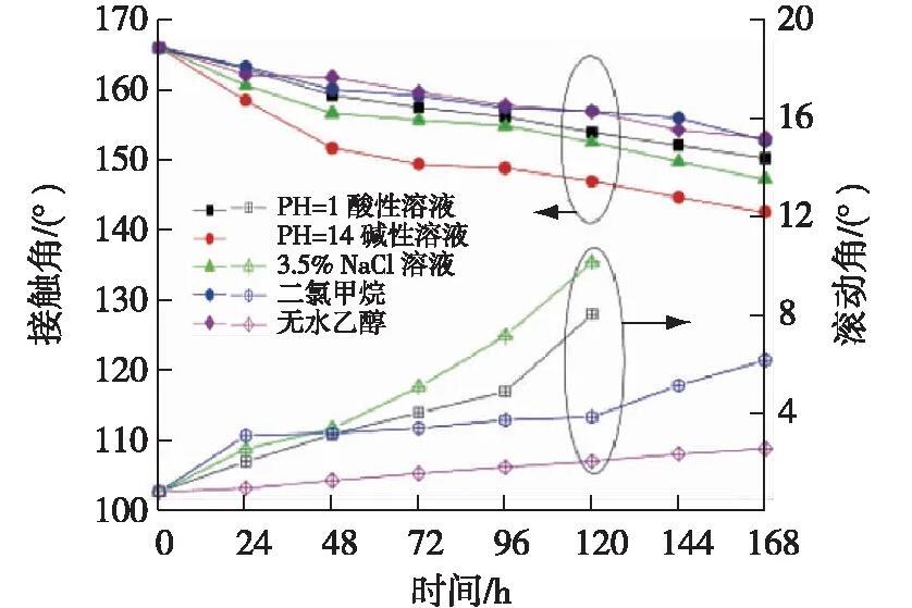 由圖4可知,超疏涂層在無水乙醇和二氯甲烷中浸泡168 h后仍然保持超疏水性能;在pH=1的酸性溶液和質量分數3.5%的NaCl溶液中浸泡120 h后與水仍然保持超疏性能。但在pH=14的堿性溶液中浸泡48 h后接觸角低于150°且已無法滾動。這說明涂層具有較好的耐酸、耐鹽水和耐溶劑性能,但是耐堿性欠佳。