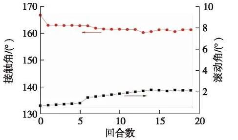 圖5為超疏涂層在經過19次磨損的每次磨損周期后對水的接觸角和滾動角變化情況。
