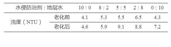 將水侵防治劑與地層水按不同比例(體積比)混合,測定其濁度值,并將其在80℃下放置4 h后,繼續測定其濁度值變化情況,以此考察水侵防治劑與地層水的配伍性,結果見表2。可以看出,水侵防治劑的自身濁度較低(僅為4.1NTU),并且其與地層水按不同比例混合后的濁度值均未明顯增大,在80℃下老化4 h后濁度值也仍小于10NTU,說明水侵防治劑與地層水具有良好的配伍性。