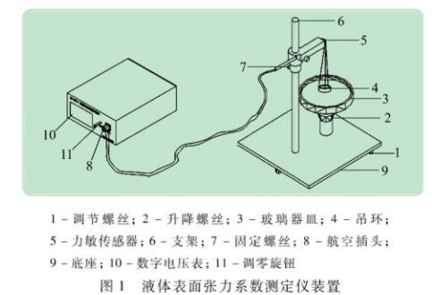 一個金屬環固定在傳感器上,將該環浸沒于液體中,并漸漸拉起圓環,當它從液面拉脫瞬間傳感器受到的拉力差值,即液體表面張力為