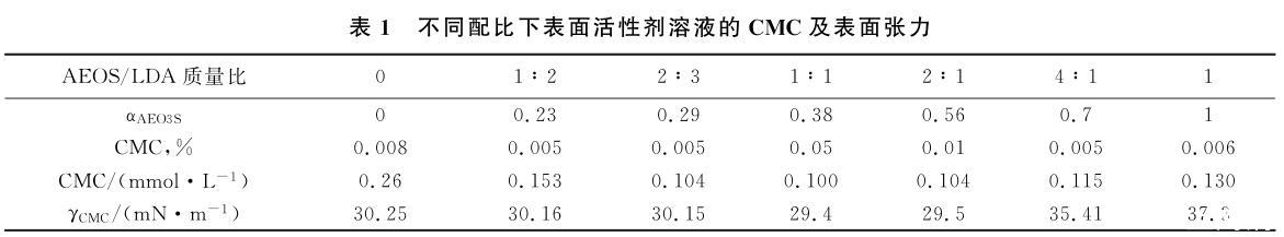 在25℃測試了AEO3S和烷醇酰胺LDA表面活性劑及其在不同質量配比下溶液的表面張力,實驗結果見圖1。根據相對分子質量計算出表面活性劑AEO3S的摩爾分數(αAEO3S)。由圖1中濃度與表面張力的關系得到溶液的CMC及對應濃度下的表面張力,實驗結果見表1。