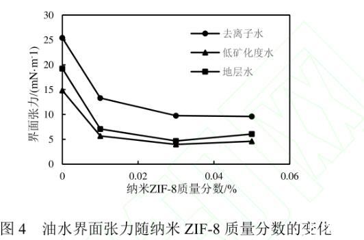 納米ZIF-8流體的穩(wěn)定性是評價其能否作為驅油劑的重要性質之一。將裝有不同濃度納米流體的樣品瓶靜置15 d后,當ZIF-8的質量分數為0.01%、0.03%時,納米顆粒在不同礦化度的流體中均保持穩(wěn)定狀態(tài),無沉淀生成,說明適當濃度的納米ZIF-8顆粒在水中有著良好的穩(wěn)定性。當ZIF-8的質量分數為0.05%時,靜置后的納米流體產生了少量沉淀,表明過高濃度的ZIF-8會互相聚結,導致顆粒變大,進而發(fā)生聚沉。