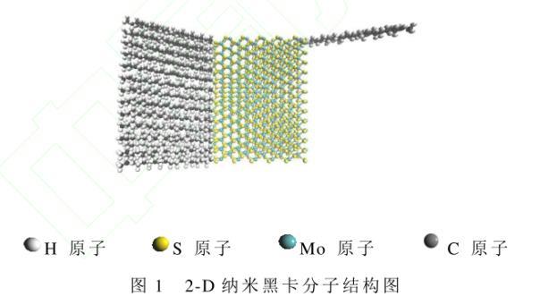 2-D納米黑卡具有雙層結(jié)構(gòu),由大小為30?×40?×12?的二硫化鉬納米片與直鏈烷烴構(gòu)成。假設(shè)理想狀態(tài)下二硫化鉬納米片無晶格缺陷,其活性位點位置確定可參見文獻,且全部被C18H38直鏈烷烴接枝,如圖1所示。