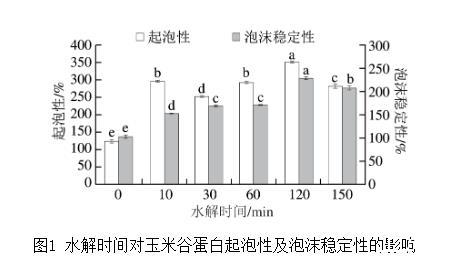 圖1水解時間對玉米谷蛋白起泡性及泡沫穩(wěn)定性的影響