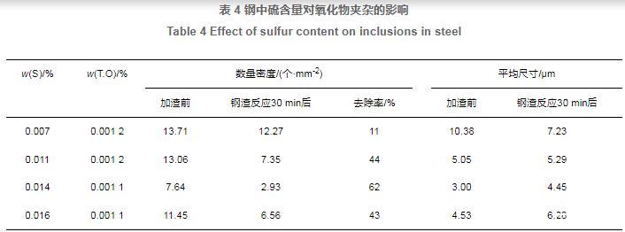 分析ASPEX全自動夾雜物分析儀掃描結果,定義MnS質量分數小于10%的夾雜物為氧化物夾雜。關注鋼渣反應前后氧化物夾雜的數量密度和平均尺寸,統計結果見表4、表5和圖4~圖7。可以看出,鋼中氧、硫含量的提高對鋼渣反應過程中氧化物夾雜去除有顯著的效果。隨著氧、硫質量分數增加,氧化物夾雜的去除率呈升高趨勢,平均尺寸呈減小趨勢。在氧質量分數為約0.001 2%的前提下,鋼中硫質量分數從0.007%上升到0.016%時,氧化物夾雜的去除率從10%上升到60%左右;在鋼中硫質量分數為0.007%的前提下,鋼中全氧質量分數從0.001 2%上升到0.004 4%,氧化物夾雜的去除率從10%上升到70%左右,氧化物夾雜的平均尺寸也呈減小趨勢。
