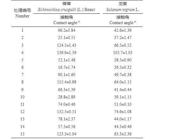 表3 15種處理作用于靶標(biāo)作物時的接觸角