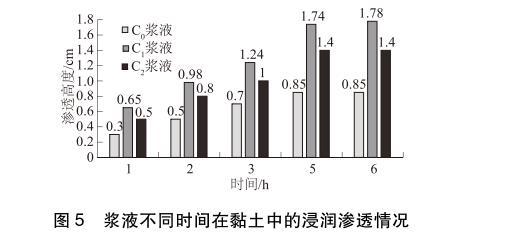 從圖5的試驗結果可知:3種漿液在開始滲透后的3h內浸潤滲透速度相對較快,3~5h之間,浸潤滲透速度相對變慢,5h后浸潤滲透高度趨于穩定。在相同時間內,漿液在黏土中的浸潤滲透高度C1>C2>C0。滲透穩定后,C1、C2漿液在黏土中的浸潤滲透高度比C0漿液的浸潤滲透高度分別提高了109.4%和64.7%,說明表面活性劑可以提高漿液的滲透性,且表面活性劑S1提高漿液滲透性的幅度更大。