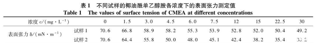 椰油酰單乙醇胺溶液的表面張力測定結果見表1。