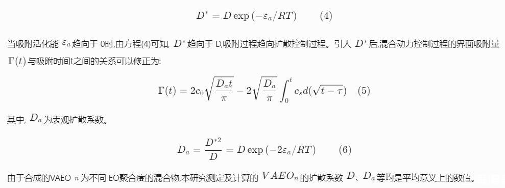擴散控制的吸附過程,表面活性劑分子由濃度差驅使進入新表面,不存在吸附勢壘。Word-Tordai方程描述了界面吸附量Г(t)與吸附時間t的關系:Г(t)=2c0Dtπ-2Dπ∫t0csd(t-τ)(1)式中,c0是溶液本體表面活性劑濃度,mol/L,D是單分子擴散系數,m2/s,cs是次表面表面活性劑濃度,mol/L,τ是整合虛設變量。方程(1)不能直接求解,可通過極限法求解。在t→0時,表面張力γ(t)近似于溶劑表面張力γ0,表面吸附接近平衡時,γ(t)近似于靜態表面張力γeq.Fainerman等用漸近的方法對方程(1)進行轉化:γ(t→0)=γ0-2nRTc0Dtπ(2)γ(t→∞)=γeq+nRTГ2eqcπ4Dt(3)方程(3)中,t→∞時,c=c0,Γeq表示靜態表面張力達到平衡時的表面吸附量。混合動力擴散吸附是指表面活性劑分子從本體擴散到次表面仍然遵循擴散機理,但從次表面層擴散到表面層時需克服一定的勢壘。Liggieri和Ravera[15,16]提出,次表面層中的分子,只有能量大于吸附活化能εa才能被吸附到表面,已吸附的分子,只有能量大于解吸活化能εb才能被解吸。以Word-Tordai方程為基礎,引入矯正擴散系數D?。矯正擴散系數D?和擴散系數D關系定義為:D?=Dexp(——εa/RT)(4)當吸附活化能εa趨向于0時,由方程(4)可知,D?趨向于D,吸附過程趨向擴散控制過程。引入D?后,混合動力控制過程的界面吸附量Г(t)與吸附時間t之間的關系可以修正為:Г(t)=2c0Datπ-2Daπ∫t0csd(t-τ)(5)其中,Da為表觀擴散系數。Da=D?2D=Dexp(——2εa/RT)(6)由于合成的VAEOn為不同EO聚合度的混合物,本研究測定及計算的VAEOn的擴散系數D、Da等均是平均意義上的數值。