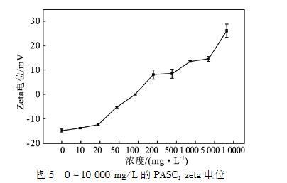 PASC1的絮凝效果見圖3、圖4.PASC1濃度為10——50mg/L時(shí),透過率接近100%,繼續(xù)增加PASC1的濃度,體系重新變得渾濁。隨著PASC1濃度的進(jìn)一步增加,體系的透過率降低,粘土顆粒懸浮體系重新穩(wěn)定。粘土顆粒的表面由于同構(gòu)取代而帶負(fù)電荷,這意味著需要陽離子達(dá)到電荷平衡。對(duì)于鈉基膨潤土(Na——BT),Na+離子被吸引到層空間中。當(dāng)Na——BT與水接觸時(shí),水可進(jìn)入晶層內(nèi)部,使可交換陽離子解離,在晶層表面建立擴(kuò)散雙電層,從而產(chǎn)生負(fù)電性。