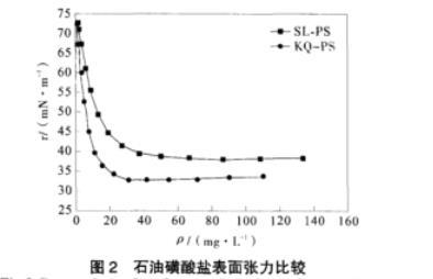 通過相關研究認為,石油磺酸鹽在降低原油-水面張力方面具有優良特性,被廣泛的應用在石油驅油中。研究認為以原油餾分與康醛抽出油因為原材料成分不同,其表面張力也不同,具體如圖2所示。