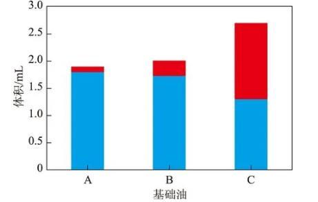 由圖1可以看出:未加復合劑時不同基礎油的分水效果不同,基礎油A和基礎油B的分水效果較好,水在離心作用下全部分出;基礎油C的極性物質含量高,親水性強,分水能力差,因此出現(xiàn)了乳化層。