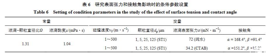 為了進一步確定液滴潤濕特性對液體附著比例的影響,筆者以碰撞速度、顆粒直徑和液滴表面張力(72 mN/m,34.2 mN/m)3個參數為自變量設置了不同的數值模擬條件,具體取值見表6。