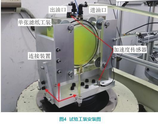 單張濾紙工裝由兩塊50 mm厚的有機玻璃制成,在頂部加工進出油口,在底部加工放水口。單張濾紙工裝和振動試驗臺通過一個特制的鋁質底座進行連接,如圖4所示。