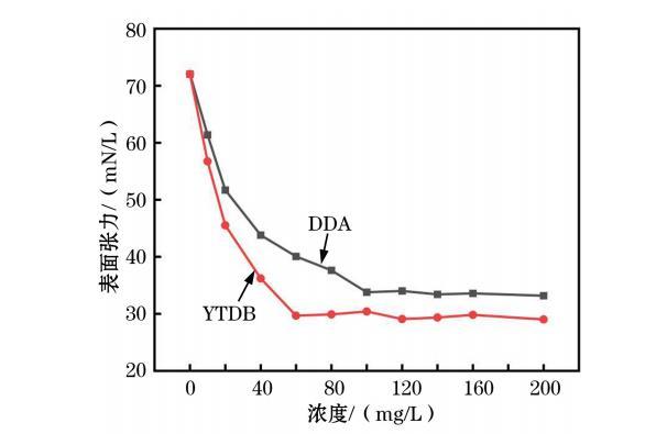 圖6顯示了DDA與YTDB在石英礦漿中的表面張力。由圖6可知,隨著捕收劑濃度增大,液體的表面張力均逐漸降低。在DDA捕收體系中,當濃度增加到100 mg/L時,液體的表面張力開始趨于穩(wěn)定,再增加DDA濃度,表面張力變化不大。故DDA體系下,液體的最低表面張力約為33.79 mN/m,臨界膠束濃度為100 mg/L;在YTDB捕收體系中,當濃度增加到60 mg/L時,液體的表面張力開始趨于穩(wěn)定,再增加YTDB濃度,表面張力變化不大。故YTDB體系下,液體的最低表面張力約為29.67 mN/m,臨界膠束濃度為60 mg/L.綜上所述,從表面張力來看,YTDB形成膠束和降低表面張力能力更強,疏水性更好,捕收能力更強。