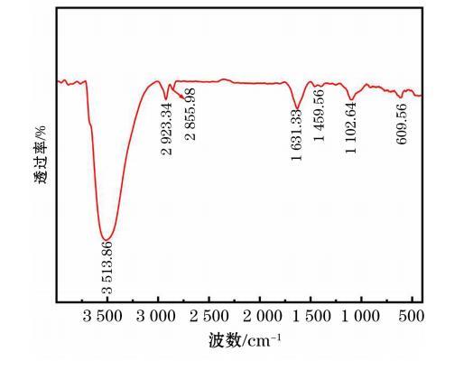 圖4顯示了YTDB的紅外光譜測試結果。由圖4可知,3513.86 cm?1處出現(xiàn)了一處弱寬峰,是N—H伸縮振動峰;2923.34 cm?1出現(xiàn)的弱峰以及2855.98 cm?1處出現(xiàn)的弱峰分別是—CH?—對稱伸縮振動峰以及非對稱伸縮振動峰;1631.33 cm?1處和1459.56 cm?1處出現(xiàn)的兩個峰,均為—NH?彎曲振動吸收峰;1102.64 cm?1處出現(xiàn)了一個弱寬峰,是C—N伸縮振動吸收峰。