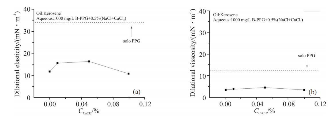 Ca2+濃度對1000mg/LB-PPG溶液界面擴張參數的影響見Fig.7。從圖中可以看出,電解質中Ca2+含量增大對界面擴張黏性的影響較小;而擴張彈性則在低Ca2+濃度條件下略有變化,從12mN/m增大到17mN/m。二價陽離子能夠與2個負電荷發生靜電吸引作用,因此,可作為“橋梁”,與不同B-PPG分子中的負電荷發生作用,增加聚集體結構的強度。Ca2+比Mg2+半徑大,與不同B-PPG分子發生作用的幾率也大,增大擴張彈性的幅度較大。