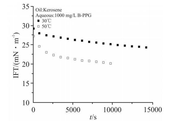 在油田開采過程中,油藏溫度是必須考慮的要素之一。對于分子結構中含聚氧乙烯基團(EO)的表面活性劑,溫度升高會破壞EO與水分子形成的氫鍵,增大表面活性劑的油溶性,對界面張力的影響較大。而對于離子型表面活性劑,溫度對界面張力的影響較小。Fig.8示出了1000mg/L B-PPG溶液在30℃和50℃時的動態界面張力。由圖可見,在50℃時,體系的界面張力比30℃時降低了5mN/m左右。B-PPG的水溶性很大程度來源于酰胺基團與水分子形成的氫鍵,因此,溫度升高,B-PPG的油溶性增大,界面吸附量有所增加,界面張力明顯降低。