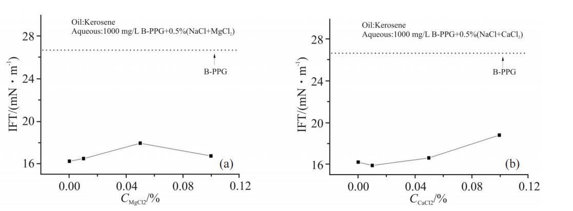 油藏地層水中含有Ca2+,Mg2+等二價陽離子,作為反離子可與B-PPG吸附膜發生作用,可能有其獨特的行為。固定水相總礦化度為0.5%,改變其中二價陽離子的含量,考察了Ca2+和Mg2+對B-PPG界面膜性質的影響。Fig.5所示為二價陽離子濃度對1000mg/LB-PPG溶液界面張力的影響。從圖中可以看出,隨著電解質中二價陽離子濃度增大,界面張力均略有升高,其中Ca2+的影響程度略高于Mg2+。從陽離子半徑考慮,Ca2+>Mg2+>Na+,因此,用二價陽離子部分頂替一價陽離子,可能造成界面分子排列的緊密程度有所降低,界面張力略有升高。Ca2+的半徑更大,界面張力的升高趨勢更明顯。