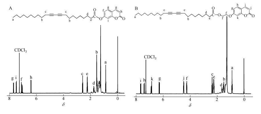 2類香豆素取代二乙炔單體參照文獻所述方法合成,分子結構及產物核磁譜圖如圖1所示。將2種產物分別溶于氯仿,配成1mg/mL的溶液。亞相為超純水(18.2MΩ·cm)。所有的π-A曲線和LB膜拉制實驗均為20℃條件下在KSV Mini-trough LB膜儀上進行。溶劑充分揮發后,膜障以5 mm/min的速率對其壓縮,在20℃和恒定膜壓35 mN/m下以2mm/min速率沉積Y-型LB膜?;瑸槭⑵?。薄膜的聚合是在16W的紫外燈(波長254nm)輻照下完成的,薄膜表面距離燈管下緣10cm,輻照時間5min。