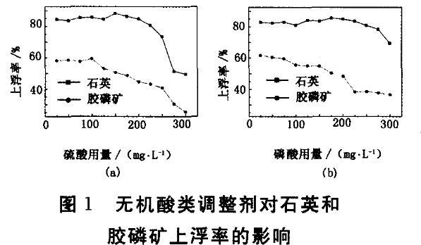 硫酸和磷酸是較為有效的膠磷礦抑制劑,工業(yè)應用廣泛。考察傳統(tǒng)調整劑對石英和膠磷礦可浮性的影響,結果見圖1。