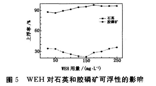 由圖5看出,使用WEH后,石英上浮率可以提高到90%以上。當WEH用量低于150 mg/L時,ZB和磷酸對膠磷礦的抑制作用不明顯;當用量超過150 mg/L時,膠磷礦上浮率逐步上升,石英和膠磷礦上浮率差異可達77個百分點,實現了石英和膠磷礦的有效分離。