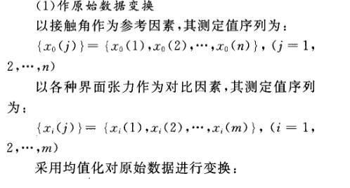灰色關聯(lián)分析是通過對統(tǒng)計序列幾何關系的比較來分清系統(tǒng)中多因素間的關聯(lián)程度,序列曲線的幾何形態(tài)越接近,則它們之間的關聯(lián)度越大。油水、水固、油固界面張力對接觸角影響程度的灰色關聯(lián)分析步驟如下。