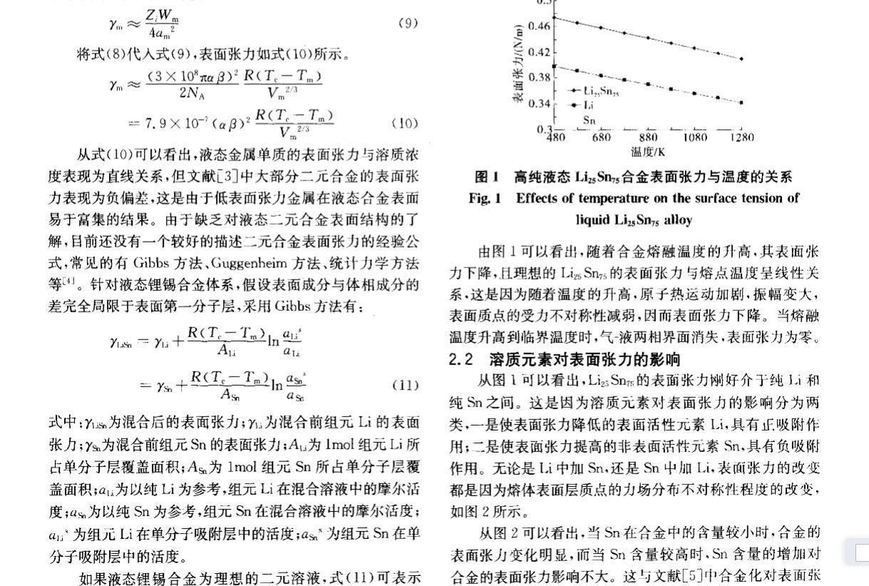 核能是公認現實可行的、可大規模替代常規能源的清潔能源。聚變堆或聚變_裂變混合堆液態金屬包層因其固有特性和優勢,在國際上被普遍認為是未來電站最具發展潛力的包層設計方案之一。作為包層氚增殖劑和冷卻劑的鋰錫合金與鋰鉛合金一樣,具有廣闊的發展前景,其制備、純化、質量輸運等工藝難題正逐步得到重視。液態金屬的表面張力不僅是認識和理解冶煉過程最基本的物理量之一,而且是氣體吸收、氣泡形核、雜質生長等界面現象的控制因素。目前對液態金屬表面張力的研究多集中于金屬單質,合金的表面或界面行為在理論或實驗上都相當不足,主要是由于精確確定表面張力十分困難[2]。針對液態鋰錫合金這種新型的核材料,從基礎研究方面看,目前還沒有一種實驗方法能確定液體界面的結構,即兩個相之間過渡區域的結構,因此需要有一些假設或模型來滿足表面張力理論的研究。