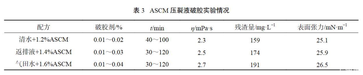 分別采用清水、氣田水配制壓裂液,參考SY/T 7627—2021《水基壓裂液技術要求》中的方法評價耐溫耐剪切性能,實驗條件為:剪切速率170 s?1,初始溫度30℃,升溫速度3℃/min,升溫至120℃后,恒溫剪切90 min。結果顯示,1.4%的ASCM在清水中的初始黏度在140 mPa·s左右,在120℃下剪切后黏度在60 mPa·s以上;1.6%的ASCM在氣田水中初始黏度為135 mPa·s,在120℃下剪切后黏度保持在50 mPa·s左右;ASCM具有良好的耐溫耐剪性能,在清水和氣田水中配制的壓裂液的流變性能都能滿足施工需求。