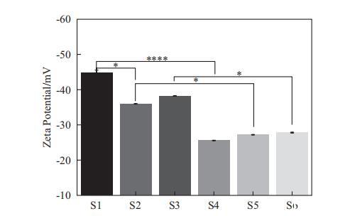 在我們的研究中,測量了Zeta電位,如圖6所示。對于SLES體系(S1-S3),S1表現(xiàn)出最負(fù)的Zeta電位,其次是S3,而S2的Zeta電位最小。對于SMCT體系(S4-S6),它們之間的Zeta電位沒有顯著差異。比較SLES和SMCT體系時,可以觀察到SMCT體系的Zeta電位低于SLES體系。此外,在S1和S4、S2和S5以及S3和S6之間發(fā)現(xiàn)了顯著差異。