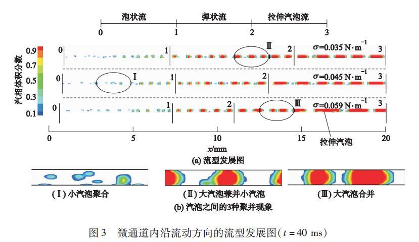 首先從汽泡在微通道的演變與流型發展的特征入手,討論不同表面張力下,矩形微通道內沿流動方向的汽液兩相分布變化的差異。圖3a給出了σ分別為0.035,0.045,0.059 N·m?1時各自的汽泡演變與流型發展的計算云圖(t=40 ms),圖3b為汽泡脫離壁面后的3種不同的聚并現象,I,II,III分別對應于剛脫離加熱壁面的小汽泡之間的聚并、較大尺寸汽泡與壁面上尚未脫離或剛脫離的小汽泡之間的聚并、尺寸相當的汽彈或拉伸汽泡之間的聚并。