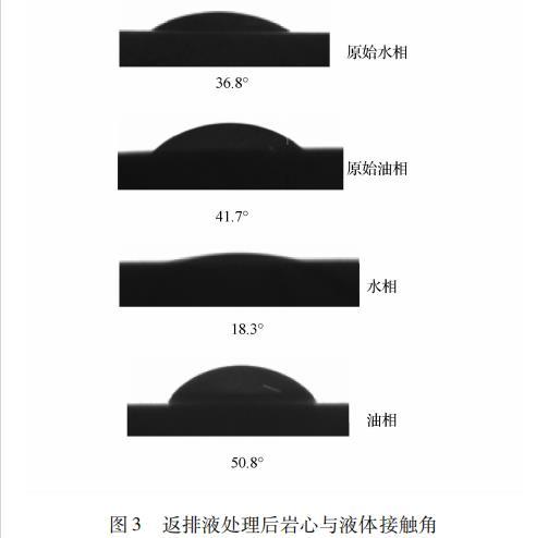 巖心原始水相、油相潤濕角均小于90°,巖石表面親水性更強。經(jīng)過返排液浸泡后巖石表面水相潤濕角變小,油相潤濕角變大。返排液浸泡后巖石表面水潤濕性更好,因為返排液中含助排劑中的表面活性劑成分,表面活性劑吸附于巖石表面,使巖石表面水潤濕性增強,并影響油、水相對滲透率,能有效的提高采收率。