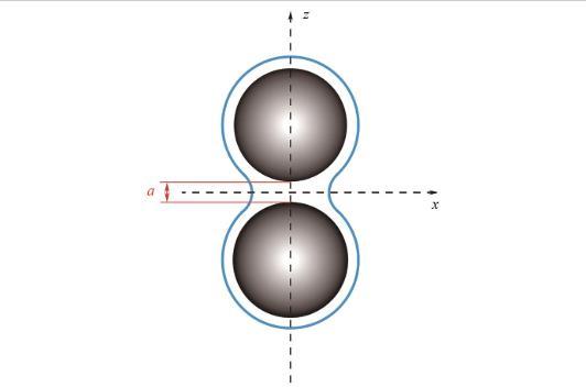 圖3說明了兩個相同球形顆粒之間的液橋結構,液橋力是由于顆粒間存在液體橋而產生的吸引力,主要由毛細力和表面張力組成。毛細力包括液橋內外的壓力差和液體表面張力在接觸角處產生的吸引力,而表面張力在液橋表面產生環向力,將顆粒拉近。液橋高度用兩顆粒之間的分離距離a(μm)表示。